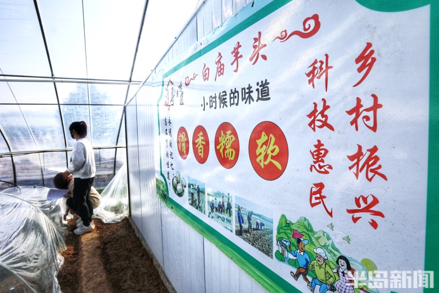 芋苗大棚内贴着白庙芋头的展示板。