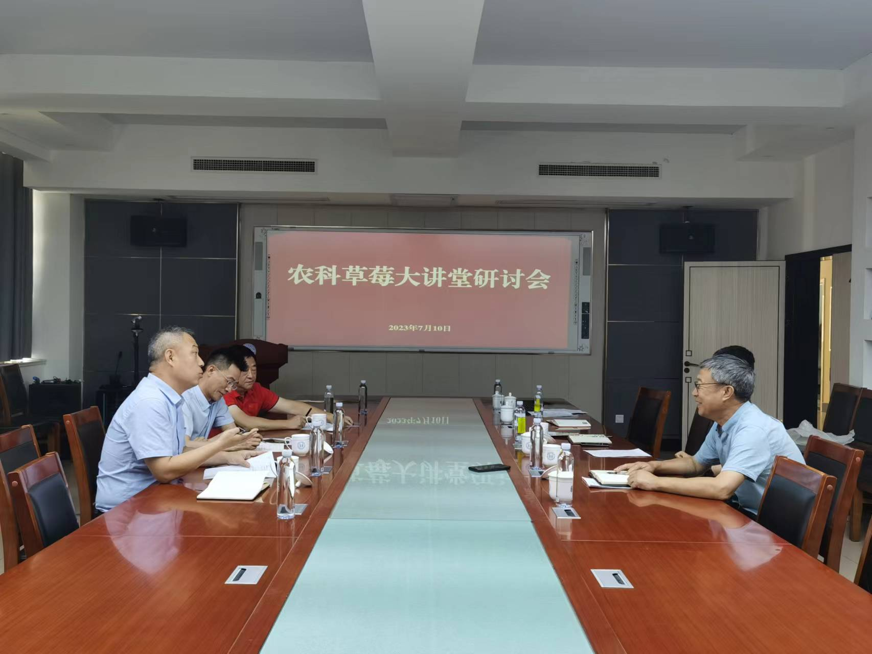 7月10日上午,太阳成集团tyc151cc在生物楼N306会议室召开“农科草莓大讲堂”战略合作研讨会,山东广播电视台农科频道副总监房翔和三农推广部主任蒋庆祝,青岛佳垦农业服务有限公司总经理杨世超,太阳成集团tyc151cc院长张忠华及副书记、副院长孙海涛,副院长程斐参加了会议。