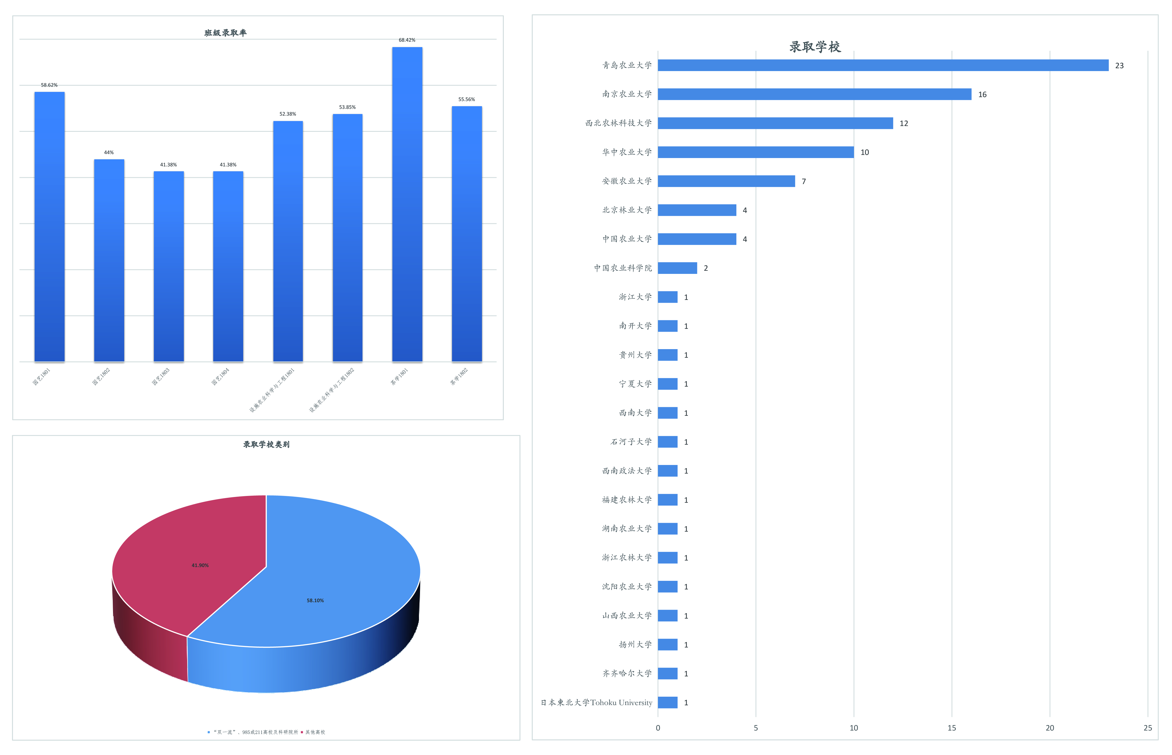 太阳成集团tyc151cc2022届本科毕业生共有183人,硕士研究生报考率达91%。报考学生以昂扬向上的心态积极备考,最终考取硕士研究生93人,录取人数较往年继续增加。8个毕业班录取率均超过40%,学院整体录取率高达50.8%,同比稳中有进,实现连续5年增长。同时,本年度考取高水平大学或科研院所的人数大幅提升,有54名学生被浙江大学、南开大学、中国农业大学、西北农林科技大学、中国农业科学研究院等高水平大学或科研院所录取,占今年录取人数的58.1%,越来越多的学生进入“双一流”、985或211等高水平大学或科研院所深造。